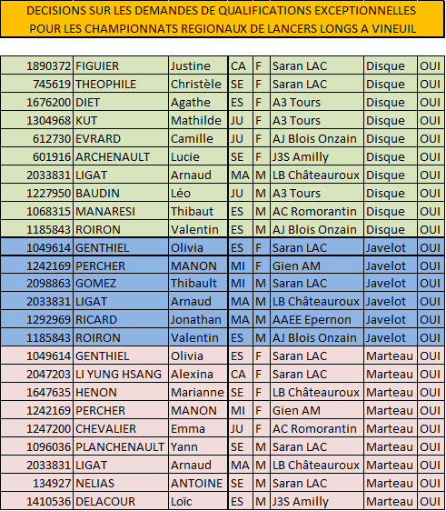 Ci-joint, le tableau concernant les décisions sur les demandes de qualifications exceptionnelles pour les championnats régionaux de lancers longs :
