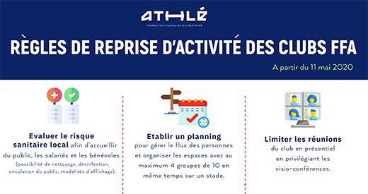 Avec la mise en place en France d’un deconfinement progressif à partir de ce lundi 11 mai, les clubs et les pratiquants peuvent reprendre leur activité en extérieur et de manière collective, en s’adaptant en fonction de sa zone géographique et en tenant compte des nombreuses consignes sanitaires. La FFA vous présente les règles de reprise.