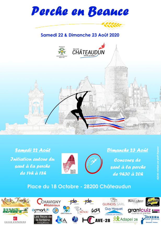 Le 23 août à Châteaudun (28), nous aurons un meeting dédié au saut à la perche pour les catégories benjamin(e)s à masters. Meeting particulier puisqu’il aura lieu non pas sur un stade, mais sur une place publique au coeur de la ville de Châteaudun.