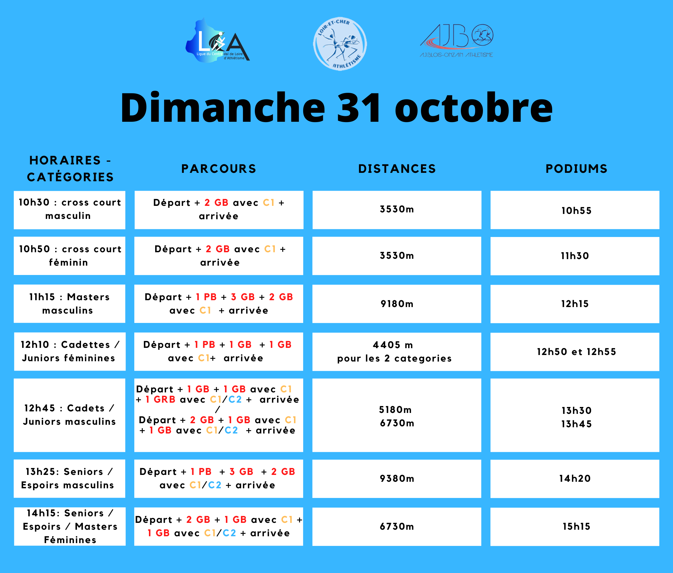 Le 31 octobre : Cross courts hommes, cross court femmes, masters hommes, cadets, cadettes, juniors hommes, juniors femmes, séniors et espoirs hommes, séniors-espoirs et masters femmes.