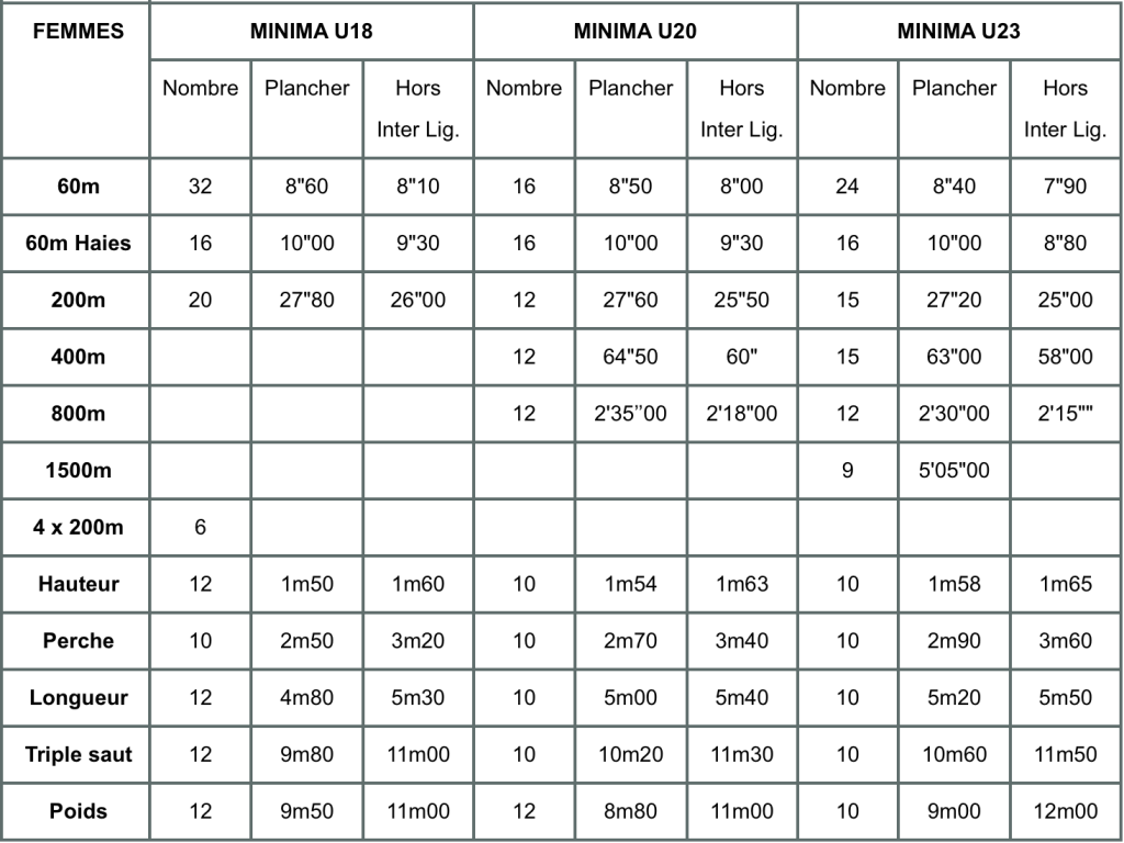 Les minima « Plancher » sont les minima automatiques pour les athlètes de la Ligue Pays de La Loire et de la Ligue du Centre Val de Loire. Les minima « Hors lnter Lig. » concernent les athlètes Hors Intérregion Centre Atlantique.