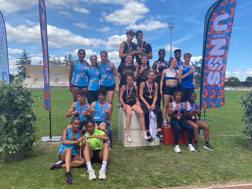 Les France UNSS ont eu lieu à Poitiers la semaine avec six athlètes de Voltaire qui pour la première fois de l’histoire de la section en estival sont revenus avec une médaille d’argent. A noter les performances de Capucine PALICOT sur 400m en 60.48S pour une cadette 1ère année chapeau ! Elle a été aussi une magnifique jeune coach rôle qui lui colle bien à la peau. Emeline DELAVILLE forte de son expérience Belge a refait le même chrono, 2min18s10 sur le 800. Diégo BOUCHAN remporte le 110m haies. Mila STOKIC et Iman BATHILDE se sont démenés sur le 100m et en longueur. Enfin Augustin BECQUET PERIGON a fait le show à la perche avec un saut à 4m70.