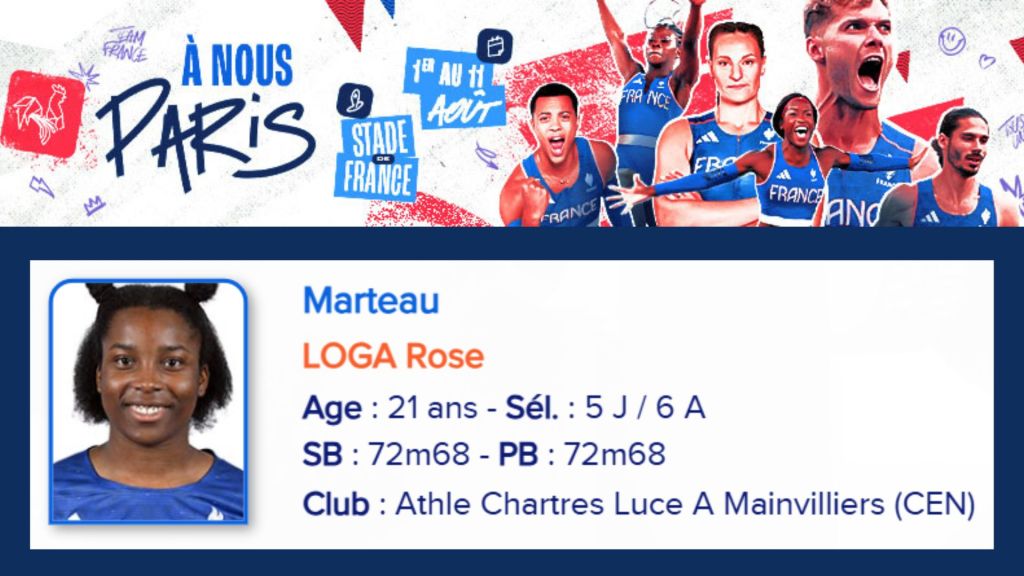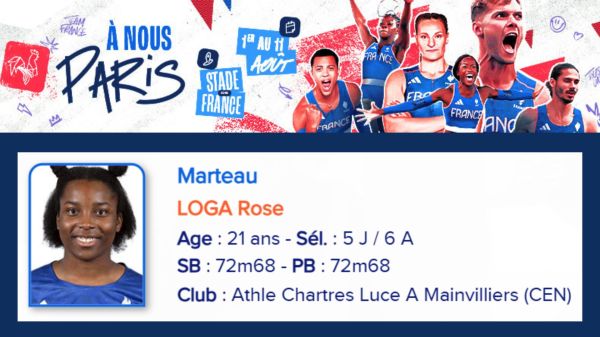 C’est officiel depuis dimanche dernier, Rose LOGA (ACLAM) est sélectionnée pour représenter la France aux JO de Paris 2024, qui se dérouleront du 26 juillet au 11 août. Elle fera son entrée dans la compétition le dimanche 4 aout à 10h20.