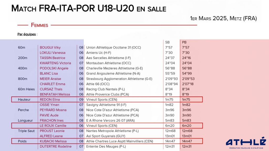 La sélection officielle pour le match par équipe FRA-ITA-POR U18-U20 en salle, qui se tiendra à Metz (G-E) le 1er mars prochain, a été annoncée hier sur le site de la Fédération Française d’Athlétisme. La Ligue est fière d’annoncer la présence de trois de ses athlètes parmi les sélectionnés.