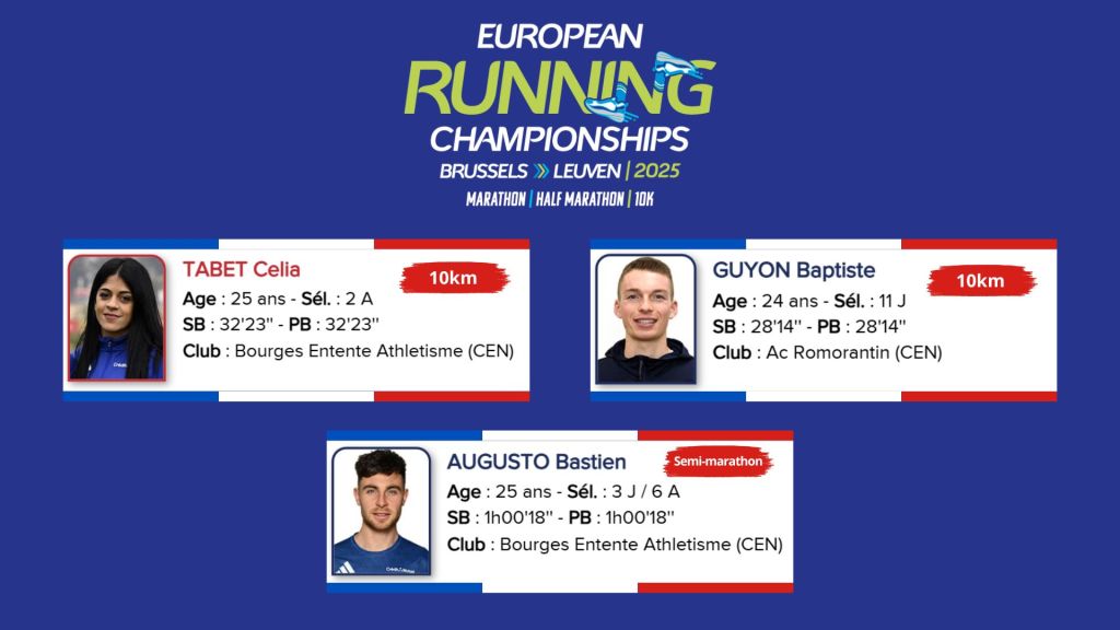 C’est officiel, la liste des athlètes français qualifiés vient d’être dévoilée, et la Ligue du Centre-Val de Loire sera brillamment représentée lors des premiers championnats d’Europe de running, qui se dérouleront à Bruxelles (BEL) les 12 et 13 avril. Célia TABET, Baptiste GUYON et Bastien AUGUSTO ont décroché leur sélection en équipe de France après avoir réalisé les minimas A dans la période impartie.