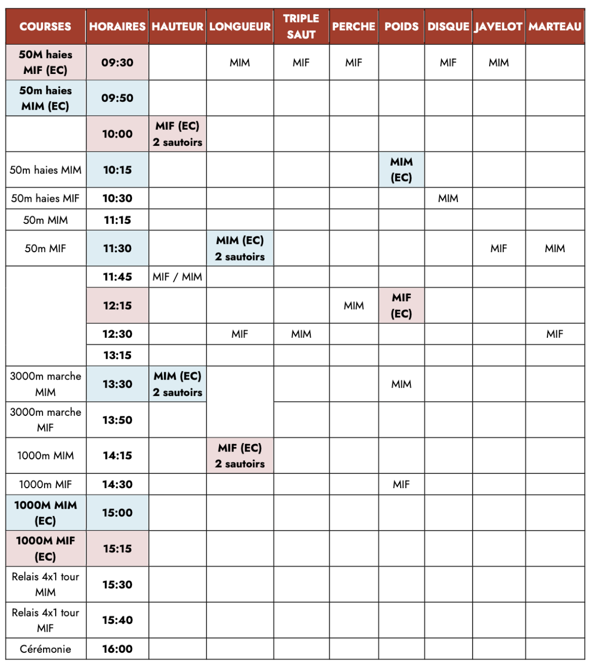 - 2 épreuves maximum par athlète, 1 course et 1 concours ou 2 concours. Ceci est également valable pour les lancers, 1 athlète pouvant faire éventuellement 1 lancer en salle (poids) et 1 lancer en extérieur suivant les horaires.
